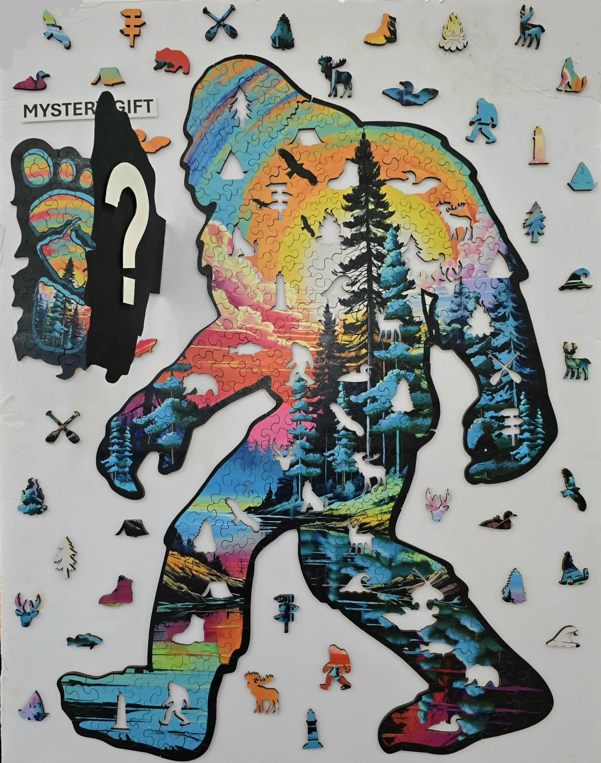 Sasquatch shape JUMBO wooden puzzle with aditional mystery gift puzzle all in one box. If you are looking for good puzzle challenge and you a know the Sasquatch this is for you. Our new JUMBO series has only 4 designs : Upper Peninsula, Minnesota, Sasquatch Lake Superior. All puzzles are made of 1/8 in. plywood and comes with wooden box . Inside the box you will find 2 wooden attachment that you can combine with the box lid and transfer it into little stand. Out wooden puzzles are made of unique shaped pieces and also includes custom pieces in the shape of animals, trees and fun adventures symbols like moose, hiking boot, tent, sign post, deer, wolf, Sasquatch, pine tree and many more. All JUMBO puzzles come with mystery gift inside. The gift is free additional wooden puzzle that follows the theme of the main design you see on the box. There is only one way to find out what this mystery puzzle is look like and it's by completing the JUMBO puzzle and then put additional puzzle together from remaining pieces. To make more fun we mixed all of the pieces together, so good luck! Made exclusively by Art Factory LLC. Featuring artwork by Kateryna Nelson